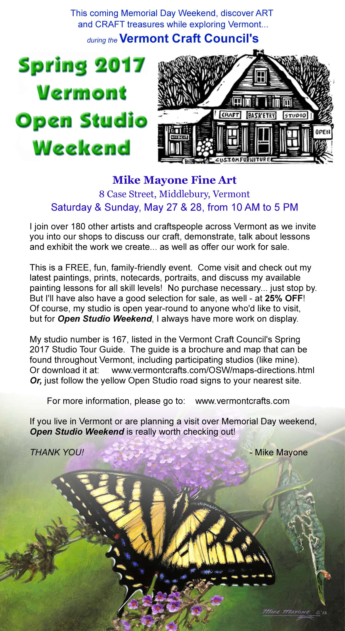 Visit the studio of local, award-winning painter Mike Mayone between10 AM and 5 PM, Saturday and Sunday to help him celebrate 25 years as a Vermont artist! Come explore his beautiful Vermont paintings, prints and notecards – and discover how easy it is to create your OWN originals with Mike’s fun and effective painting lessons!